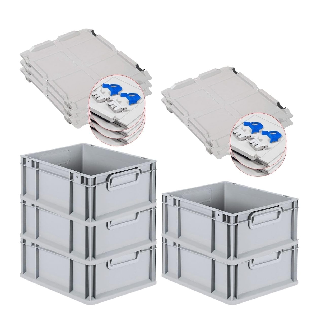 PROREGAL SparSet 5x Eurobox NextGen Economy mit Auflagedeckel & 4x Verschlüsse Schwarz, Griffe offen, HxBxT 32x40x60cm, 65L, Eurobehälter, Box