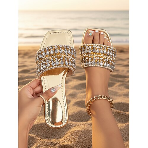 sandali da donna con strass dorati, eleganti scarpe estive basse per la spiaggia, casual e per le vacanze