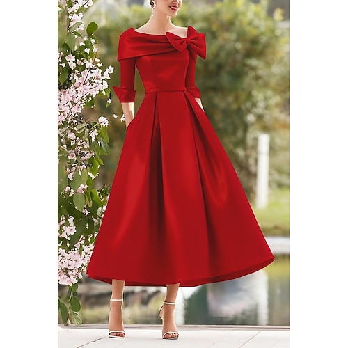 Linea ad A Lunghezza Tè Abiti da Cocktail Abiti da festa Elegante Vintage Manica 3/4 Collo quadrato Matrimonio Formale Tasca Raso con Fiocco/Fiocchi Tasca