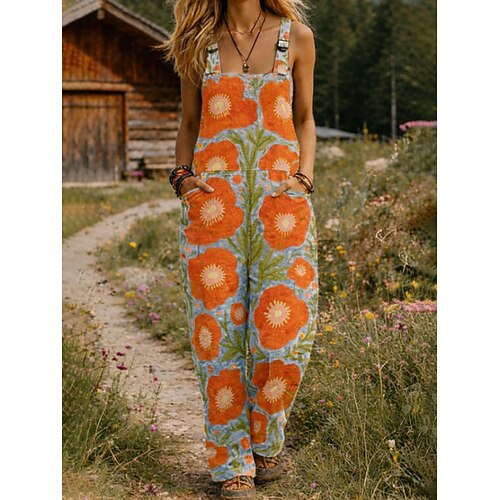 Per donna Salopette Attivo Floreale Senza Maniche Senza maniche Dritto Collo quadrato Tasca con tasca Vacanza Quotidiano Vestibilità comoda Arancione Verde Beige Estate