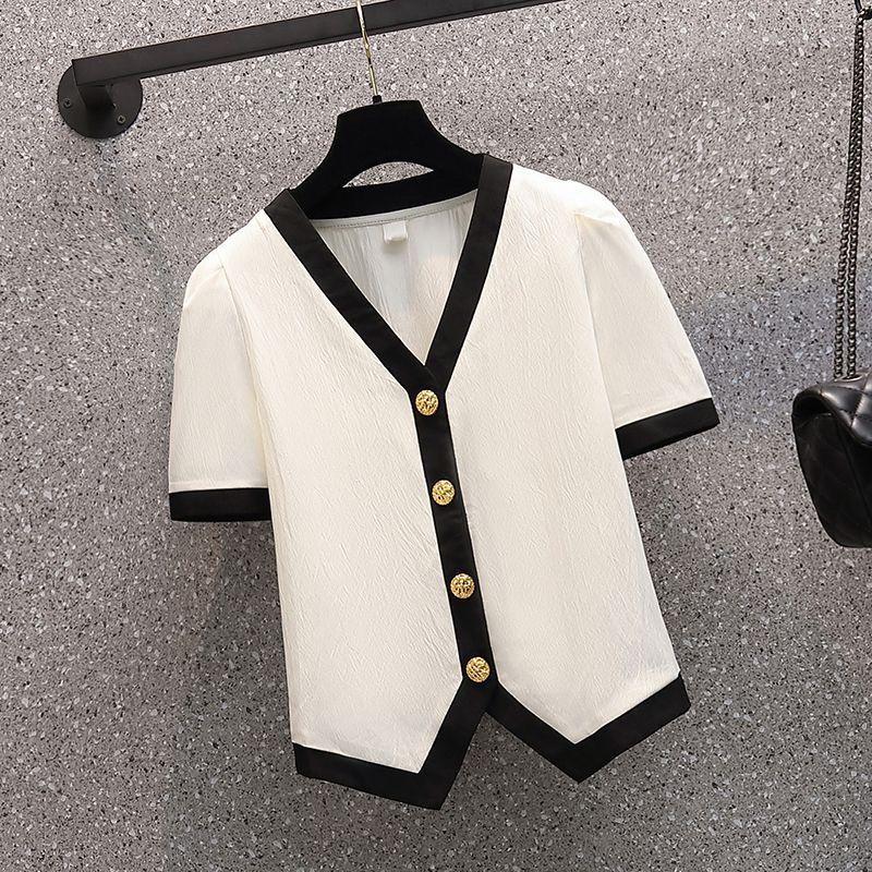 French Office Lady Slim Fragrant Summer Shirt New V-neck Cardigan Short Sleeve Women's Button Simple Chic Fashion White Tops cm black