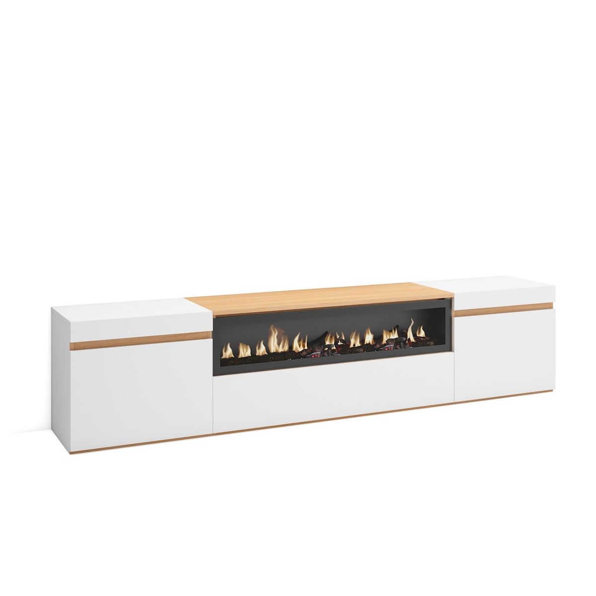 SKRAUT HOME TV-Schrank, Lowboard, 200x45x35cm, Für TV-Geräte bis zu 80", Elektrokamin., Weiß und Eiche Soft