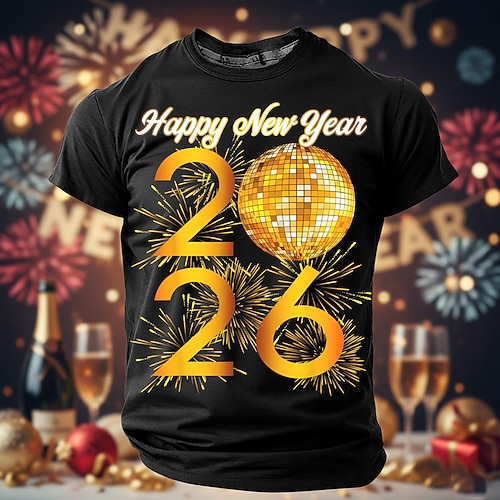 Capodanno Per uomo Buon anno Fuochi d'artificio 2026 Maglietta Manica Corta maglietta Stampa 3D Girocollo Camicia Esagerato Designer Artistico Feste Streetwear Club Nero Rosso Autunno Inverno