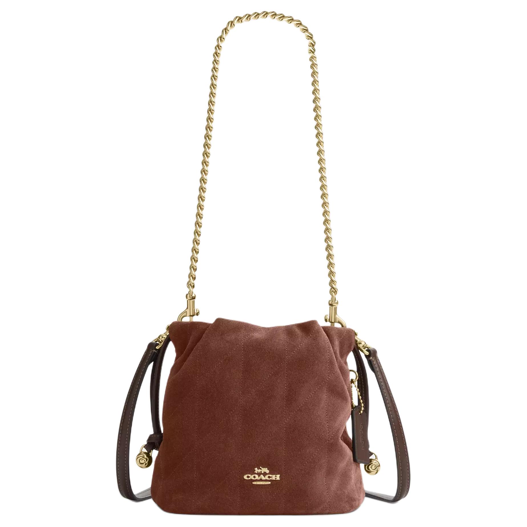 Coach Faye 18 Gold Logo Beuteltasche Wildleder Glattes Leder Crossbody Umhängetasche Mini Vintage Braun Damen Taschen CDC42-IMYEF