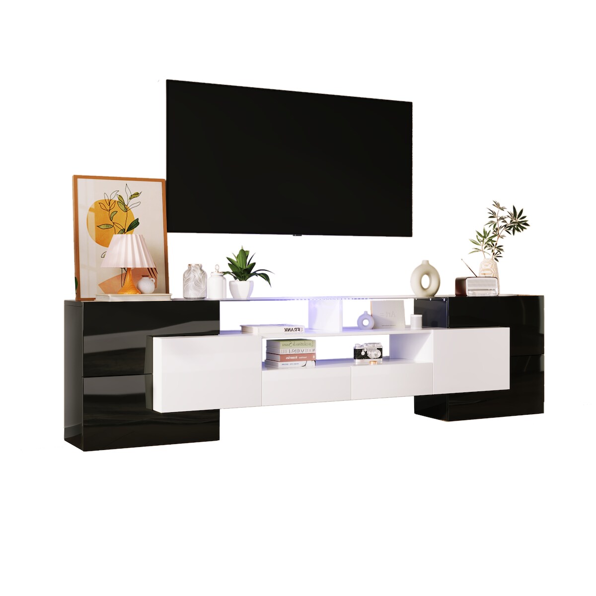 OKWISH TV-Ständer Hochglanz Weiß Schwarz 200x35x60 cm 4 Türen 2 Schubladen 3 Fächer LED Wohnzimmer TV-Möbel modern stilvoll