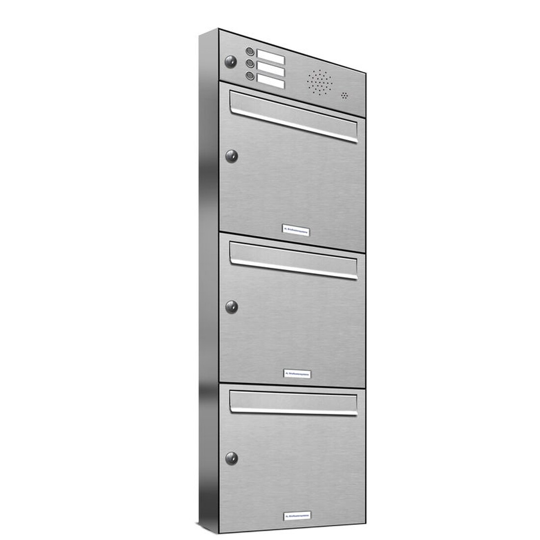 AL Briefkastensysteme 3 Fächer Premium Edelstahl Wand Briefkasten Anlage mit Klingeln, Post A4, modern, robust, wetterfest, Artikelnummer: 331V3EA1KS