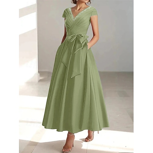 Abiti da cocktail A-Line eleganti formali per ospiti di matrimoni lunghezza alla caviglia manica corta V collo in satin con fiocco/i