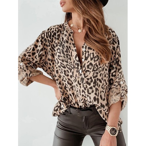 Per donna Blusa Leopardo Vintage Casual Manica Lunga Colletto a Camicia Top Regolari Quotidiano Bottoni Stampato Argento Giallo Albicocca Primavera Autunno