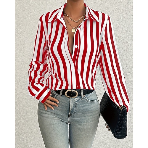 Per donna Camicia Blusa A righe Elegante Manica Lunga Colletto a Camicia Top Regolari Quotidiano Ferie Uscire Patchwork Bottoni Nero Rosso Marrone Estate Primavera