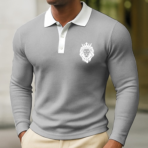 Per uomo Animale Leone Magliette Polo a Nido d'Ape Manica Lunga Magliette polo Camicie con Colletto Casual Abbigliamento da lavoro Abbigliamento quotidiano Bottoni Primavera Autunno Inverno Blu Nero