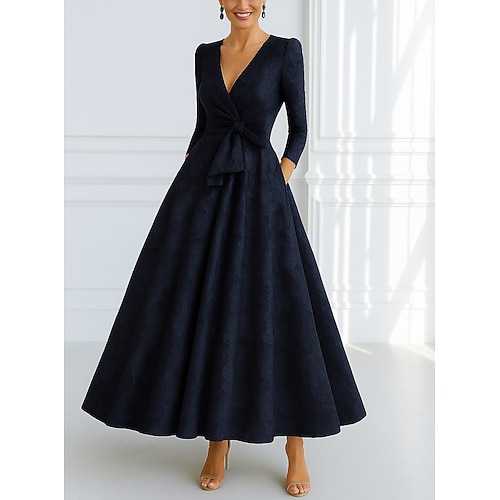 Abito da Natale A-Line Abito da Sera Elegante Ospite di Nozze Abito Formale Black Tie Cocktail Party Lungo Maniche Lunghe Scollatura a V in Raso da far colpo