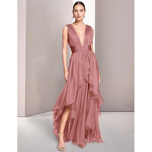 Abiti da prom A-Line per matrimoni in spiaggia Abito Elegante Formale Estivo Asimmetrico Senza Maniche V Collo Chiffon con Ruches