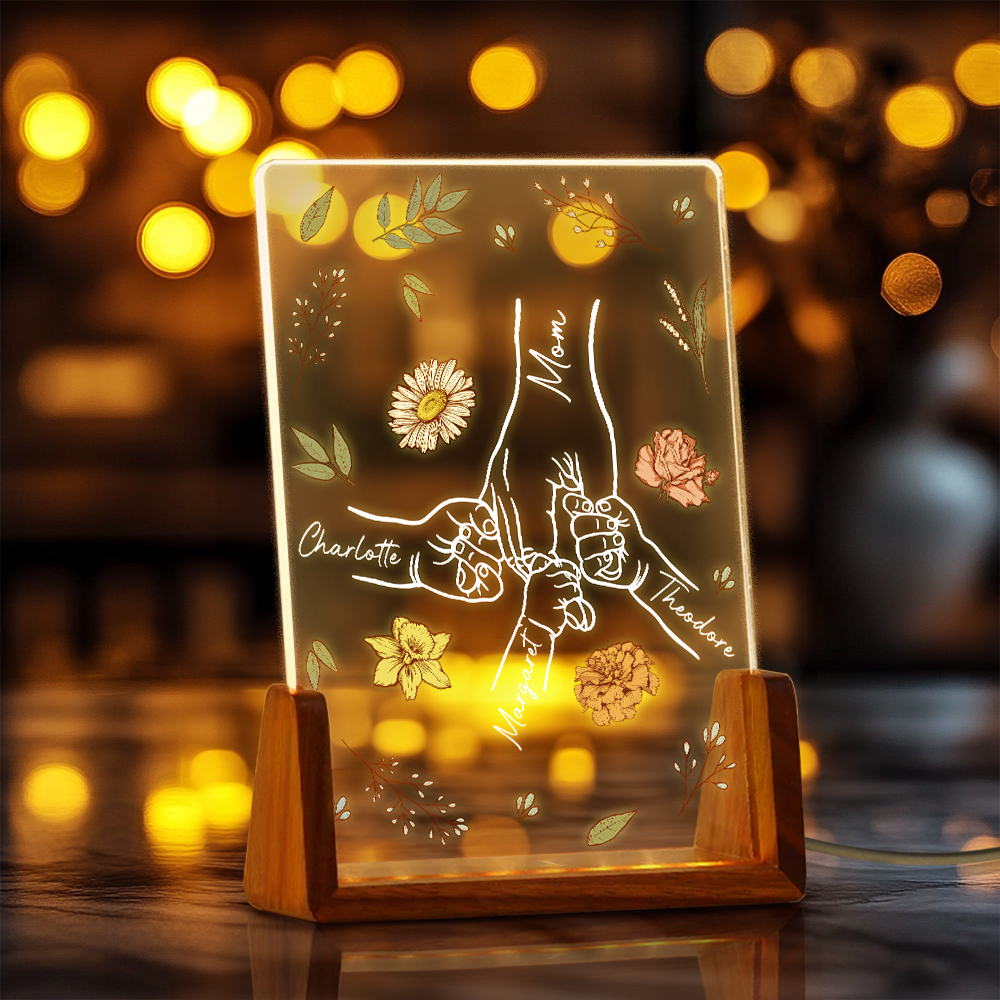 Fiore di nascita personalizzato Mamma e bambino che si tengono per mano Luce notturna a LED con base in legno e 1-6 nomi di bambini Regalo di compleanno per la festa della mamma nonna