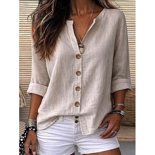 Per donna Blusa Camicia in finto lino Bottoni Tinta unica Quotidiano Casual Manica 3/4 Scollo a V Top Regolari Quotidiano Blu Nero Bianco Rosso Arancione Estate Primavera Autunno