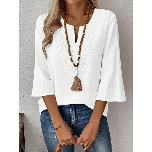 Per donna Blusa Pizzo Patchwork Tinta unica Elegante Bohemien Casual Manica 3/4 Scollo a V Top Regolari Quotidiano Blu Nero Bianco Blu marino Verde Estate Primavera Autunno