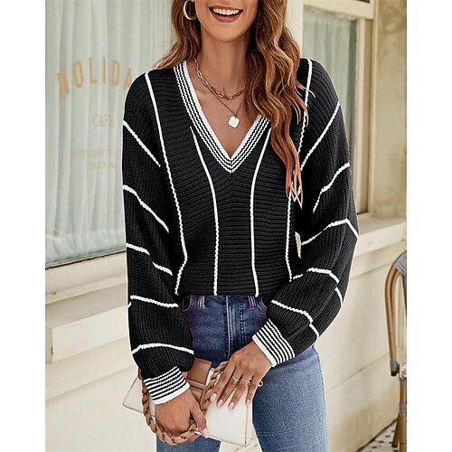 Per donna Felpa Maglione Elegante Vintage Moda Tinta unica Grafico A righe Scollo a V Lavorato a maglia Stampato Foro Manica Lunga Top Regolari Maglia All'aperto Quotidiano Ferie Rosso bordeaux Nero