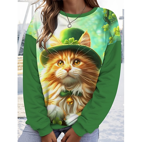 Felpa da donna di San Patrizio con stampa gatto Street Casual Collo Crew Maniche Lunghe Micro-elastico Primavera Autunno