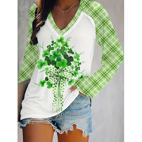 T-Shirt da donna di San Patrizio con grafica Piante Elegante Stilosa Classica Maniche Lunghe Collo a V Top Regolari Stampa Quotidiana Uscita Weekend Bianca Verde Scuro Verde Estate Primavera Autunno