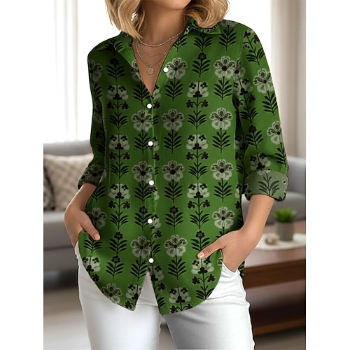 Per donna Camicia Floreale Retrò Vintage Etnico Manica Lunga Colletto a Camicia Top Regolari Quotidiano Ferie Tasca Bottoni Stampato Nero Vino Fucsia Estate
