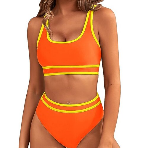 Bikini da donna 2 pezzi costume da bagno colorblock alta vita snellente senza schiena vacanza beach wear striscia scollo a V senza maniche