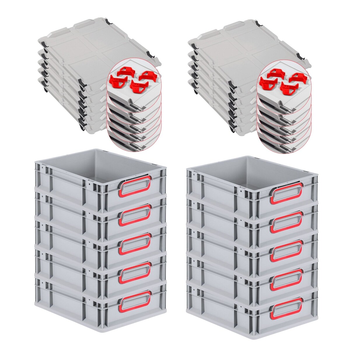 PROREGAL 10x Eurobox NextGen Color mit Auflagedeckel & Schiebeschnappverschlüsse | HxBxT 12x30x40cm | 11L | Griffe rot zu