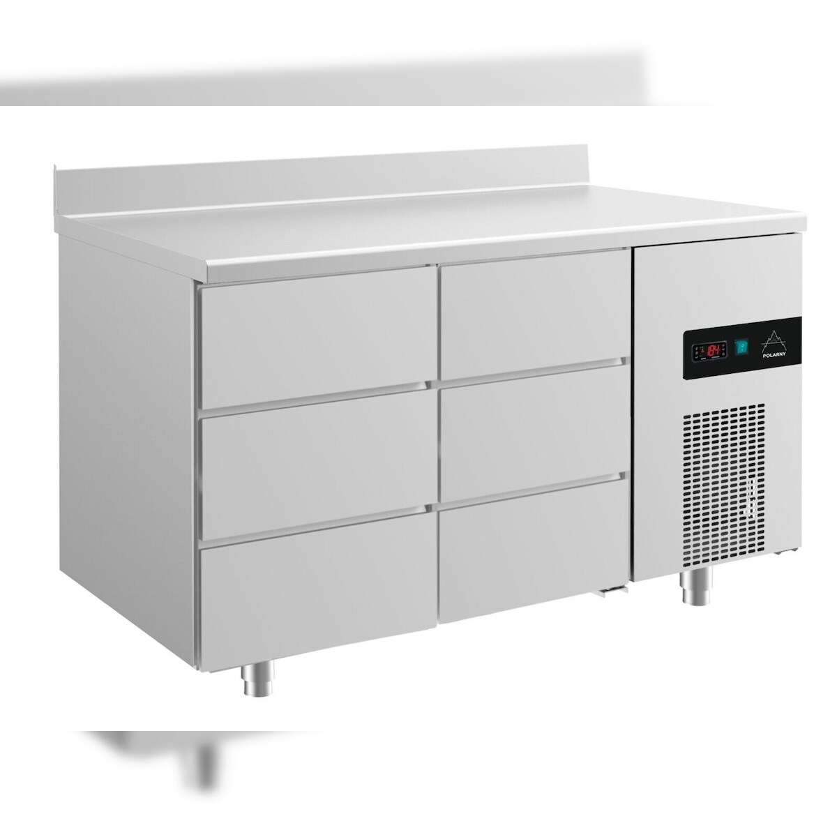 Gastro Edelstahl Kühltisch Umluft 3 links /3 Schubladen rechts Aufkantung, 1400x700x850mm -2/+8°C