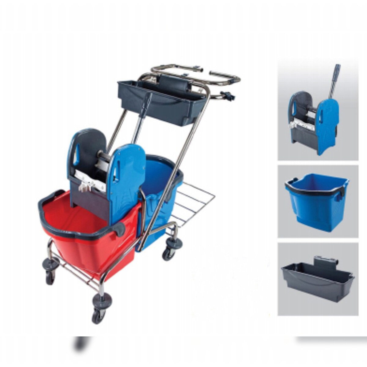 CleanSV Reinigungswagen chrom 2 x 18 Liter Eimer, Presse, Deichsel, Ablage + 2 x 5 L- Eimer