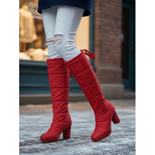 stivali alti fino al ginocchio trapuntati impermeabili da donna: stivali invernali con tacco caldi e isolati, moda elegante per il freddo, per la neve, abbigliamento all'aperto e gite in vacanza