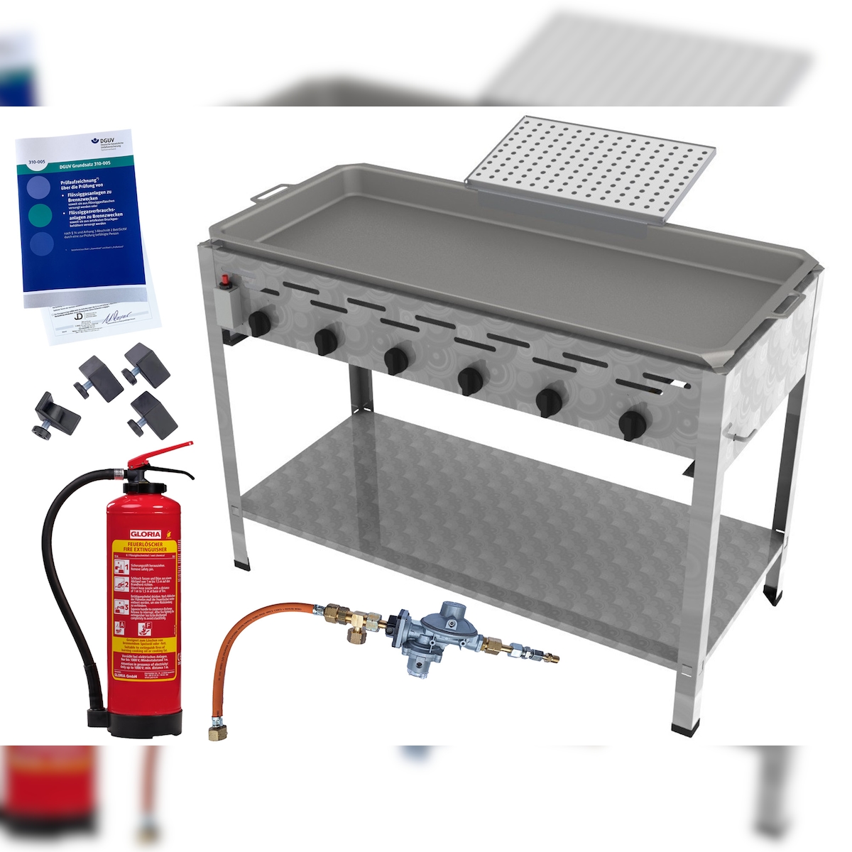 ChattenGlut Reibekuchenbräter 6-flammig 27kW, mit Fettbrandlöscher GLORIA FA6 EASY, Gasdruckprüfung, Gewerberegler, und Kartoffelpuffer Aufsatz