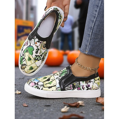 scarpe da ginnastica slip-on da donna per Halloween - scarpe da skate in tela con stampa di carte da gioco e graffiti colorati per outfit autunnali casual e street style spettrale