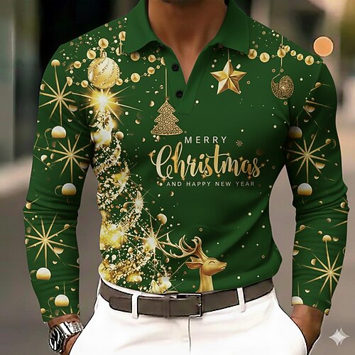 Natale Per uomo Ogni Albero di Natale Polo Manica Lunga Magliette polo Bavero Casual All'aperto Ferie Abbigliamento quotidiano Abito da festa Stampa 3D Bottoni Primavera Autunno Inverno Nero Rosso