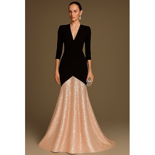 Abito da sera A-Line nero rosso sirena trombetta lungo fino al pavimento elegante alto spacco con maniche a 3/4 scollo a V formale per matrimonio in crepe stretch con volant
