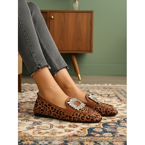 mocassini da donna con stampa leopardata e fibbia in cristallo: scarpe basse eleganti e comode con dettagli in pelle marrone, abbigliamento casual per le attività quotidiane e le gite del fine settimana