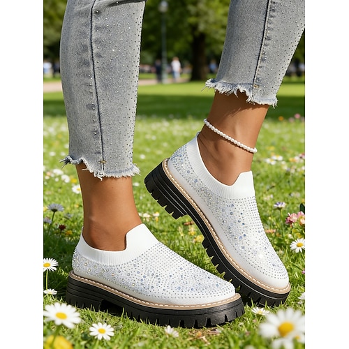 scarpe slip-on da donna in maglia rosa con dettagli in strass e suola spessa, comode scarpe casual da indossare tutti i giorni, per passeggiate, viaggi, shopping e gite del fine settimana