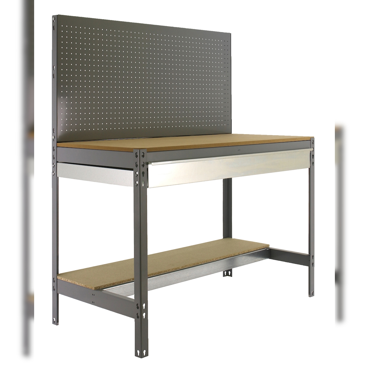 SimonRack Arbeitsbank ohne Schrauben mit Holzschalen und mit Simonwork BT2 -Boxschublade. Grau/Holzfarbe 1445x1510x610 mm