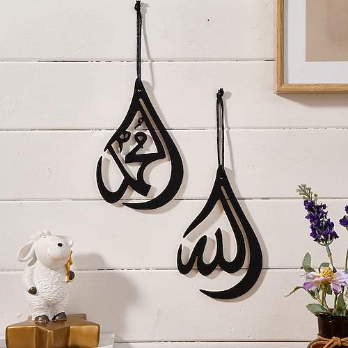 2 etichette decorative in legno nero scavate a forma di goccia d'acqua con simbolo islamico, adatte per feste, celebrazioni, artigianato decorativo, regali decorativi e ornamenti da appendere per la
