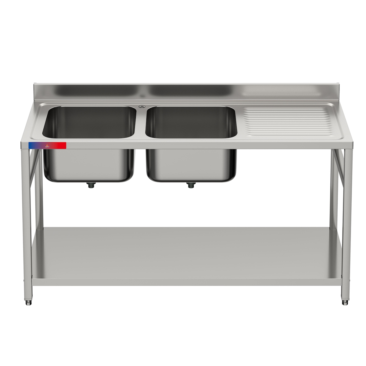 Gasfrit – Industrielles Spülbecken aus Edelstahl mit 2 Becken und 1 Abtropffläche, 1600 × 600 × 850 mm
