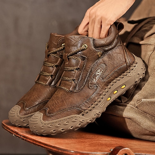 scarponi da uomo in similpelle marrone, da esterno, con suola in gomma resistente e dettagli cuciti a mano, comodi scarponi da lavoro casual per escursioni e uso quotidiano