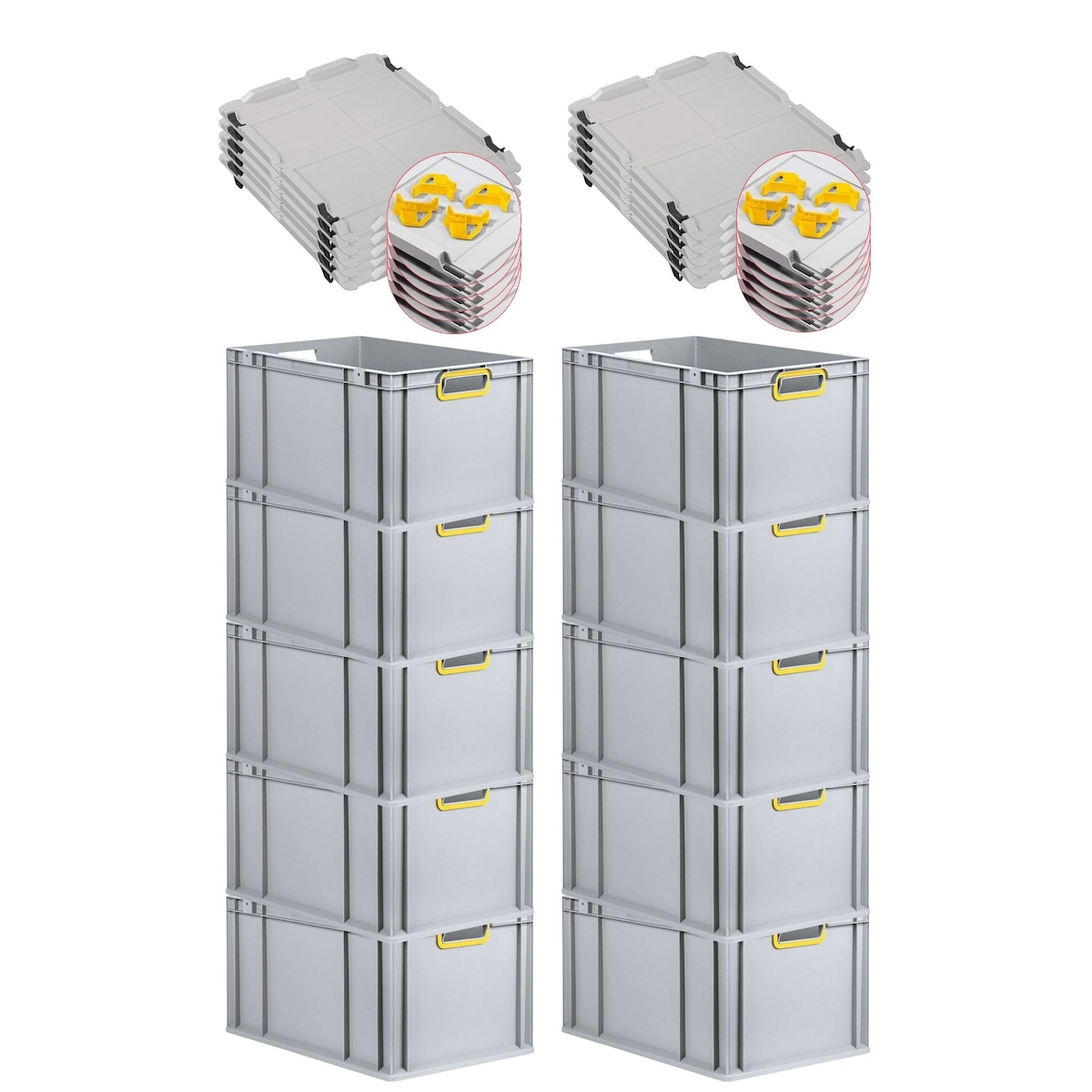 PROREGAL SparSet 10x Eurobox NextGen Color mit Auflagedeckel & Verschlüsse, HxBxT 32x40x60cm, 65L, Grau, Griffe gelb offen, Eurobehälter, Box