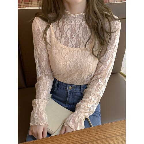 Per donna Camicia di Pizzo Blusa Semplice Elegante Manica Lunga Manica a Palloncino Girocollo Top Regolari Ferie Uscire Pizzo Rete Nero Bianco Rosa Albicocca Estate Primavera