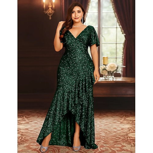 Abito a sirena trombetta A lunghezza terra Abito da matrimonio Abiti formali Abito da sera Abito per madre della sposa Maniche corte Collo a V Elegante Vintage Taglie forti con paillettes con