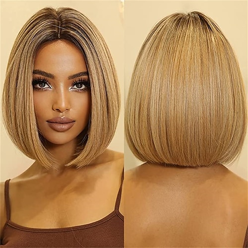 parrucche caschetto castano per donna biondo mette in risalto la parte centrale dei capelli sintetici corti e lisci