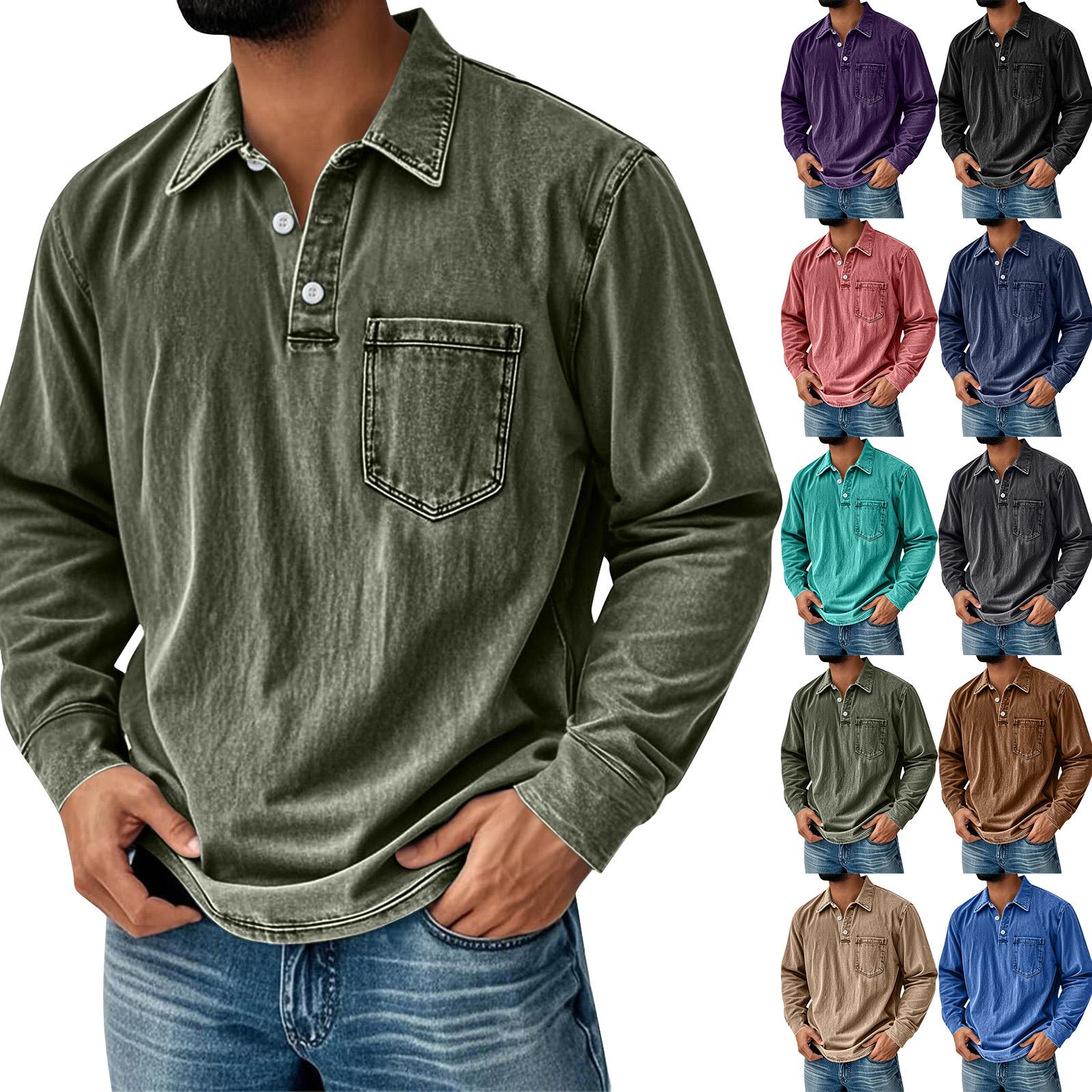 Men's Solid Color Washed Sports Button Pocket Lapel Collar Long Sleeve Top cm Dark blue