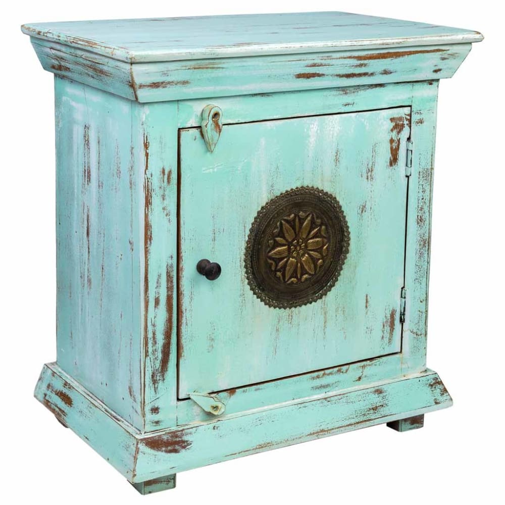 Table de chevet bois et métal avec finition artisanale verte 55x35x60