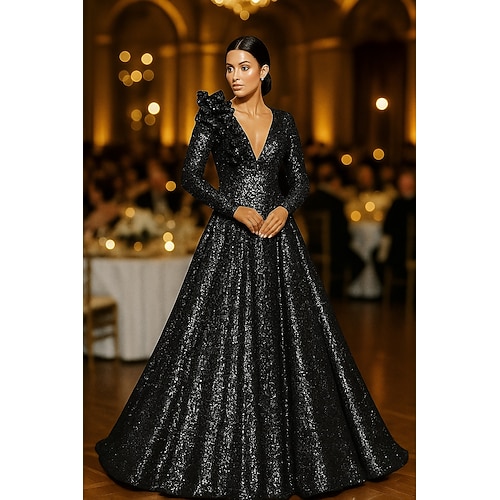 Linea ad A Lunghezza al pavimento Abito da Sera Abito formale Elegante Brillanti Manica Lunga Scollo a V Matrimonio Formale Con Paillettes con Glitter Paillettes