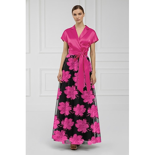 Linea ad A Lunghezza al pavimento Abito da Sera Elegante Setoso Manica Corta Colletto a Camicia Matrimonio Formale Tasca Raso Jacquard con Fiocco/Fiocchi Stampa