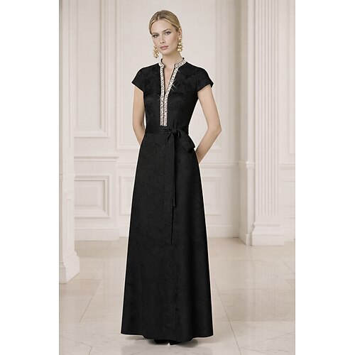 Linea ad A Lunghezza al pavimento Abito da Sera Elegante Floreale Manica Corta Scollo a V Matrimonio Formale Tasca Jacquard con Stampa floreale Cristalli