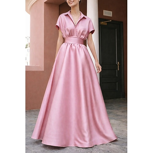 Linea ad A Lunghezza al pavimento Abito da Sera Abito formale Elegante Quotidiano Setoso Manica Corta Colletto a Camicia Matrimonio Formale Raso con Arricciato