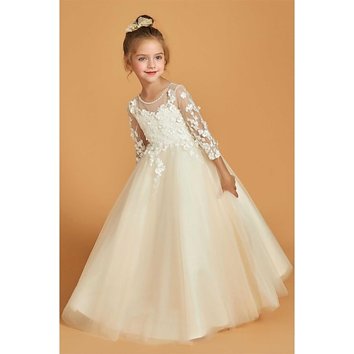 Linea ad A Lunghezza al pavimento Abito da damigella d'onore bambina Prima comunione Ragazze Abito da ballo carino Raso con Applicazioni Elegante Misura 3-16 anni