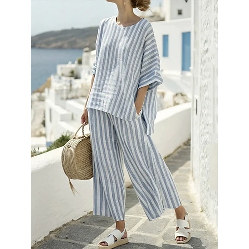 Completi di pantaloni in lino sintetico da donna top bolero maniche 3/4 collo tondo moda a righe streetwear casual quotidiano all'aperto blu nero bianco estate vestibilità morbida
